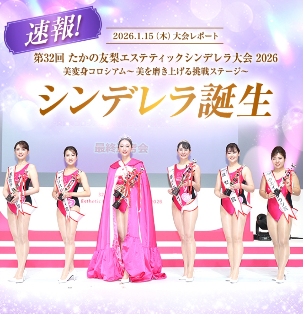 エステティシャンと二人三脚で心身の美を磨き続けた3ヵ月。その集大成となる「第32回たかの友梨エステティックシンデレラ大会2026 美変身コロシアム~美を磨き上げる挑戦ステージ~」の最終選考会が、2026年1月15日(木)、スパイラルホール青山にて開催されました。サロンのスタッフはもちろん、家族や友人、職場の仲間の応援をチカラに変え、挑戦を重ねてきたファイナリストたちが集結! 引き締まったボディと自信に満ちた表情でステージを歩く姿に、会場は大きな感動と拍手に包まれました。