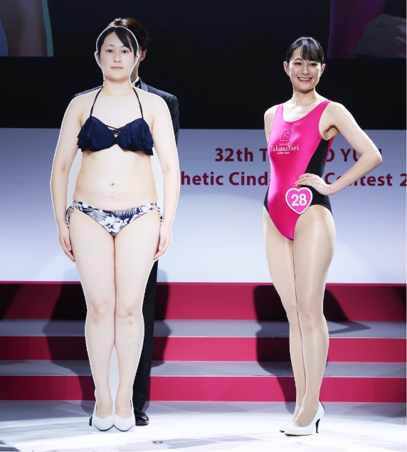 第1次水着審査では、マントに身を包んだシンデレラたちがステージへ。3ヵ月前の太っていた自身の等身大パネルと並び、マントを外してその変身ぶりを鮮やかに披露しました。引き締まったボディラインの変化は一目瞭然。思わずどよめきと驚きの声が上がる会場で、これまでの成果をアピールしました。