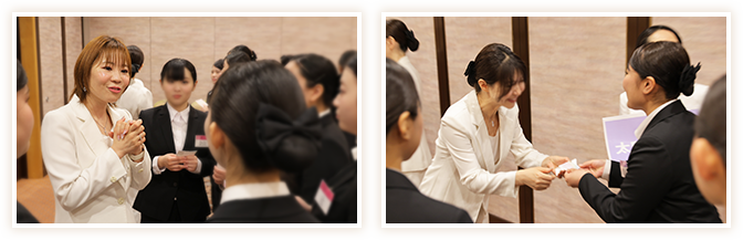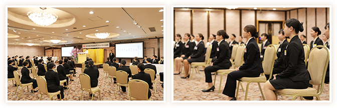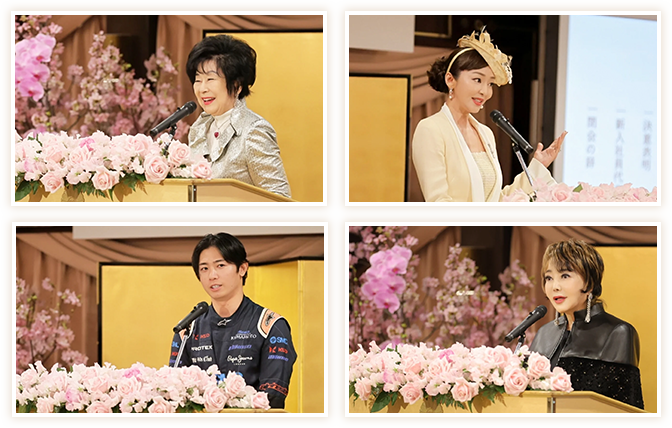 式典では、ご来賓の元参議院議員議長 山東昭子様、モデル・ファッションデザイナー 神田うの様、レーシングドライバーの金丸ユウ様から、寄り添う接客の大切さや、感謝と学び続ける姿勢、挑戦とチームワークの重要性について力強い祝辞が贈られ、新入社員たちは頷きながらその言葉を胸に刻みました。