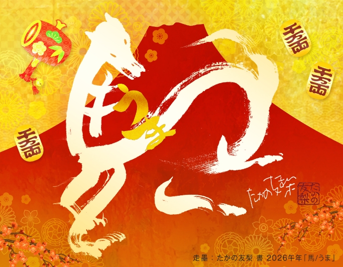 今年の走墨には、決意表明も兼ねて、あらゆる運、とりわけ金運を引き寄せる「白馬と金色のうま」を描きました。馬は、果てしない情熱を持ち力強く駆け抜ける活力の象徴です。皆さまと共にこの勢いにあやかって、元気で楽しく、喜びあふれる素晴らしい一年を過ごせますよう心から願っております。